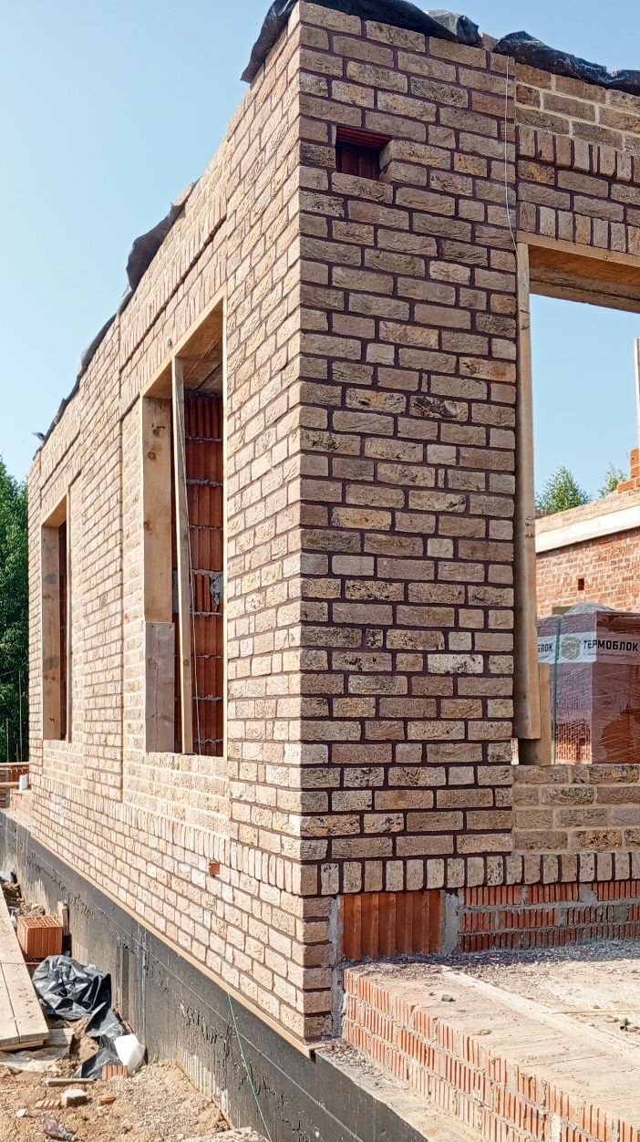 Обрамления окон (размерами 120х102х65, 215х102х65) выполнены из облицовочного кирпича ручной формовки Донские Зори "Архангельское" и цветная кладочная смесь PEREL шоколадного цвета.